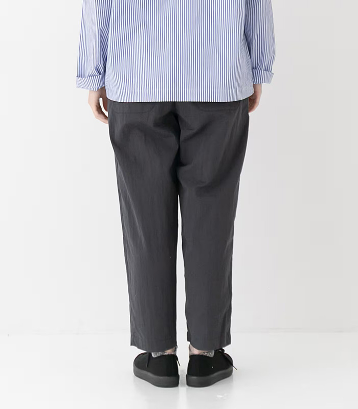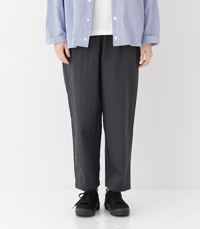 ナチュラルな風合いが魅力のコットンナイロンギャバ素材を使用した、RINEN定番のラクパンツ。タテ糸にコットン、ヨコ糸にナイロンを用い、高密度に織り上げることで、コシとほどよい反発感を持たせた生地に仕上げています。さらりとした肌触りと適度な厚みで、長いシーズン活躍する一本です。