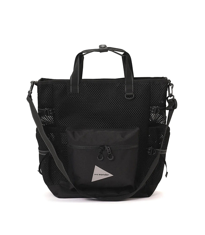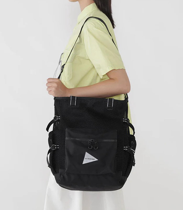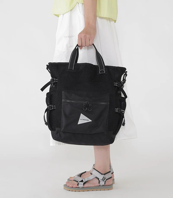 立体的に厚みを持たせて編んだポリエステルメッシュ素材を使用したトートバッグ。背面ポケットに収納可能なショルダーストラップを使用するとリュックとして背負うこともできます。取り外し可能なショルダーストラップも付属していて斜め掛けも可能。実測容量23L ポケット1L