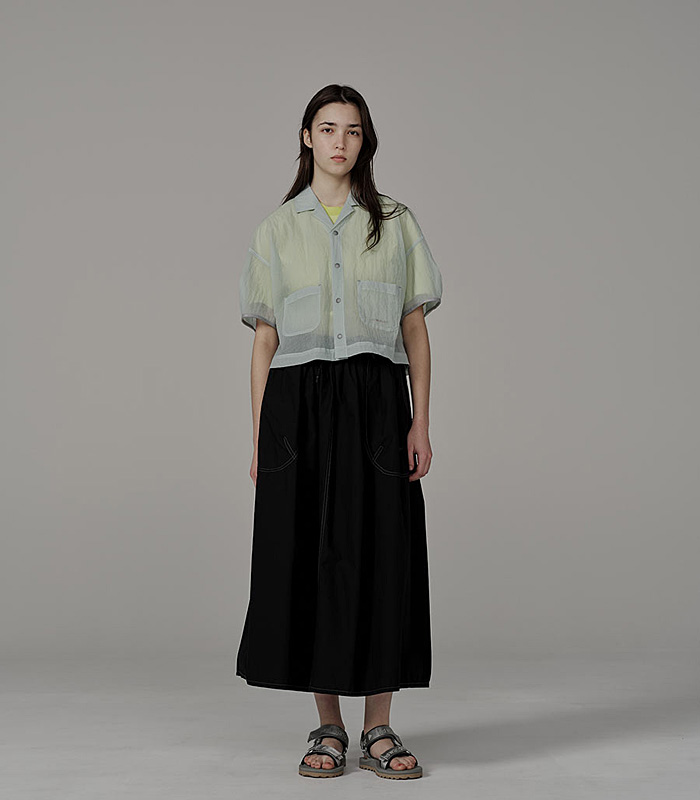 素材には、細かな格子状の織りが特徴のリップストップナイロンを使用。非常に軽量でハリのある質感に加え、ほんのりとした透け感があり、涼しげで抜け感のある雰囲気を演出します。インナーの色や素材によって表情が変わるため、コーディネートの幅が広がるのも魅力です。