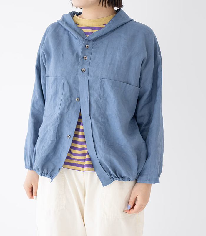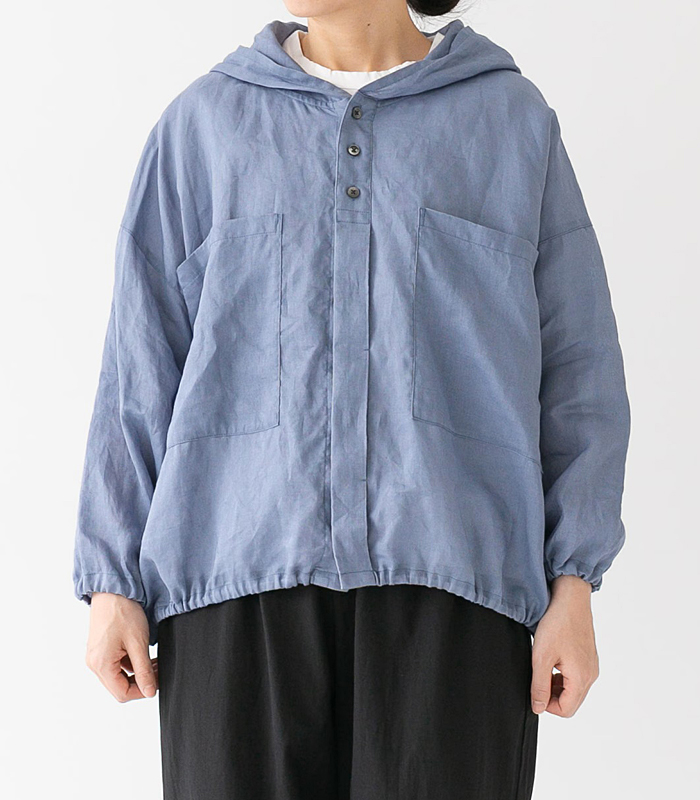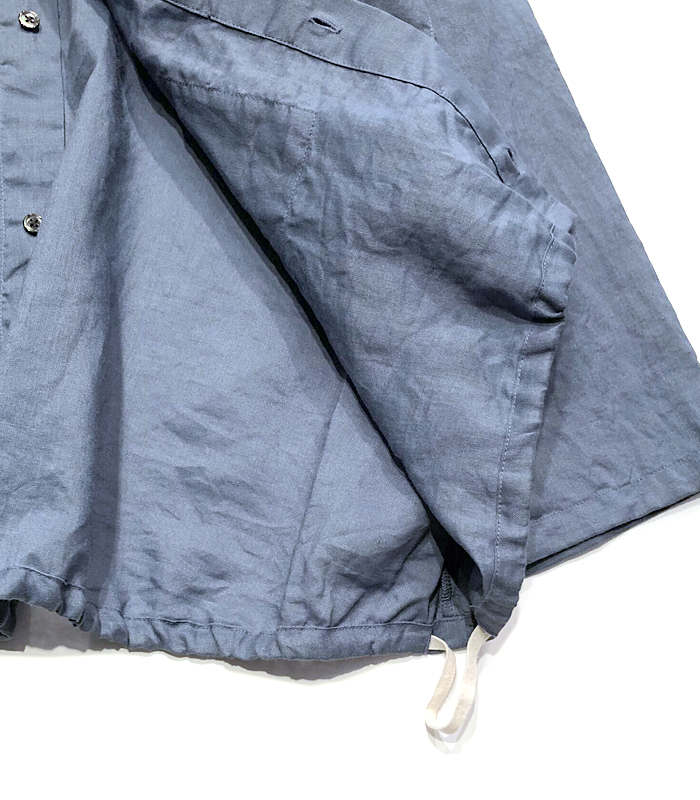 デザイン面では、上から3つ目までボタンを見せ、それ以降は比翼仕立てにすることで、すっきりとした印象に。袖口と裾にはコードが施されており、絞ることでシルエットの変化も楽しめます。カジュアルにもナチュラルにも合わせやすく、幅広いスタイリングに活躍するアイテムです。