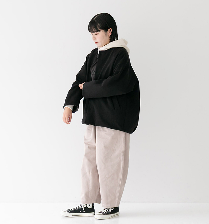 程よい厚みがあり、これからの季節にぴったりの素材感。アームホールにはゆとりがあり、重ね着しやすいデザインです。肩馴染みのよいラグランスリーブ仕様と、裾に入ったタックで生まれるコクーンシルエットが特徴。袖を折り返してもアクセントになります。