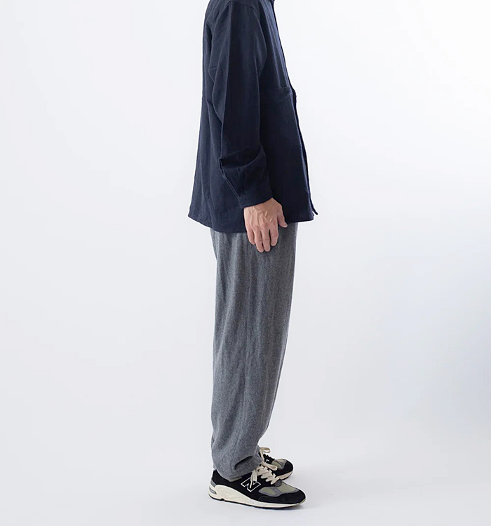 シルエットはウエストとヒップにゆとりをもたせ、膝下からはすっきりとしたテーパードラインに。リラックス感とシャープさを両立し、幅広いスタイリングに対応します。ウエストはゴム+紐仕様。重さを感じず、軽快にジーンズスタイルを楽しめるのも魅力。デイリーに活躍する新しい定番パンツです。