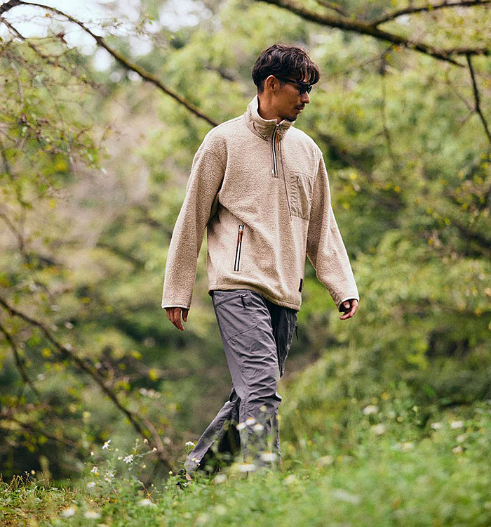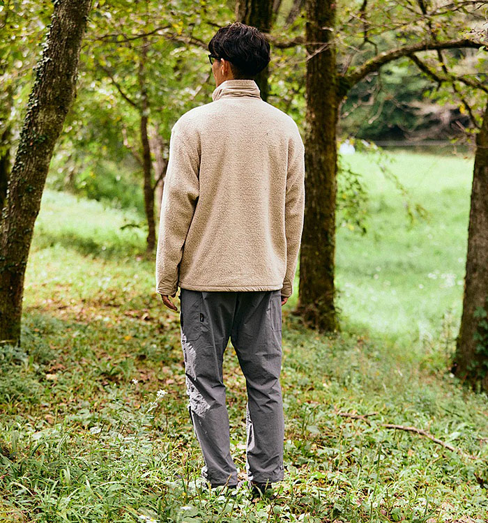 糸に節のあるネップ糸を使用し、1950年代の綿生地を再現した風合い豊かな素材を使用。葉カスを残した生成り仕上げにすることで、生地本来の表情を活かした粗野感のある佇まいに仕上げています。ライトオンスながらもしっかりとしたコシがあり、頼りなさを感じさせない素材感が魅力です。