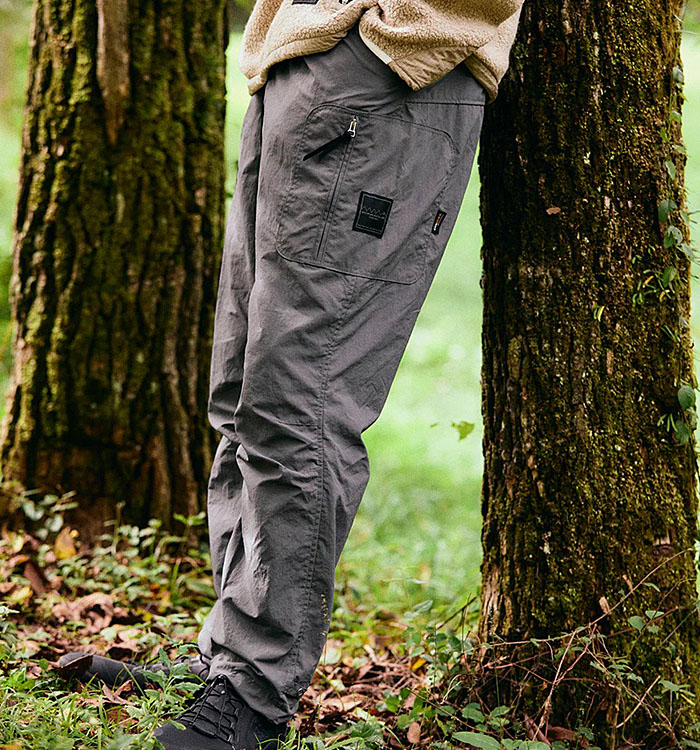 前がチャコールグレー、後はネイビーの生地でで切り替えた、細身シルエットのシンプルなロングパンツ。動きに合わせて生地がよく伸び、風も程よく通ります。ウエスト部は、あたりがソフトなヒモ付きの幅広ストレッチ生地。リラックス時にはヒモはフリーのままでも、ある程度ウエストでキープできます。左右についた共生地の大きなポケットには脱いだウィンドシェルくらいなら収納可能。中にはスマホサイズのインポケットが付いています。膝とふくらはぎに刺繍のワンポイント。裾には脱ぎ穿きしやすいスリットが入っています。