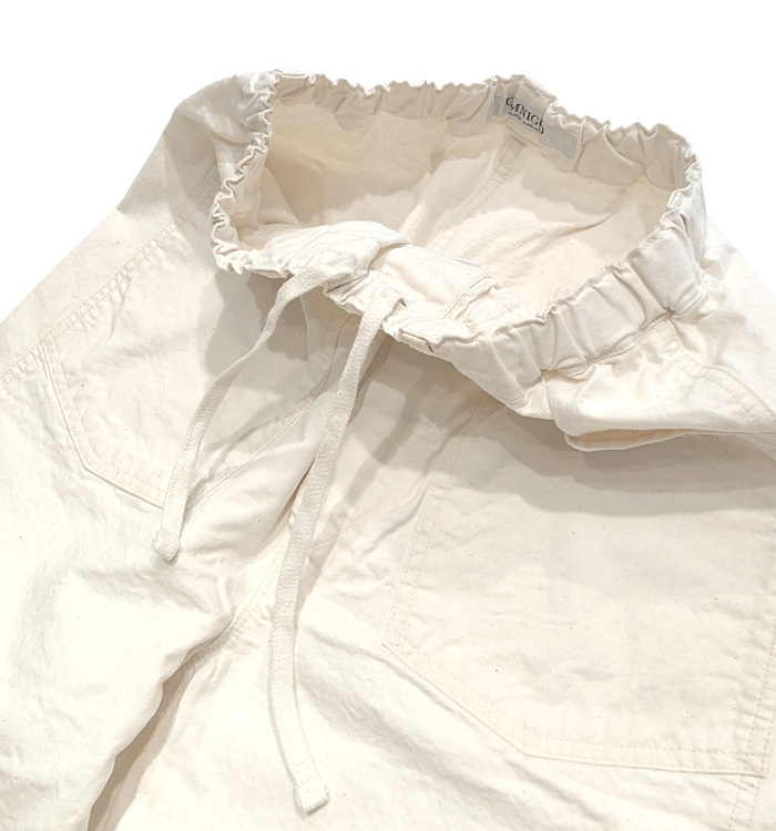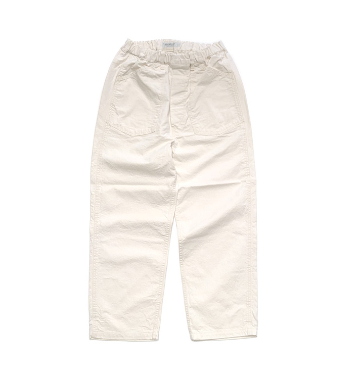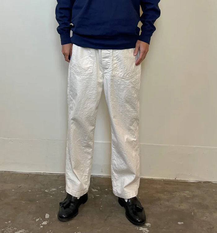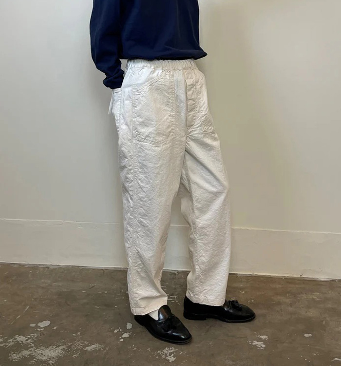 30〜40年代のアメリカ軍ワークパンツをベースにデザインされた一本。ウエストにはゴムと紐を配し、リラックスした穿き心地にアレンジしています。サイドシームに沿って配されたひし形のアウトポケットが、さりげないアクセントとして存在感を放ちます。