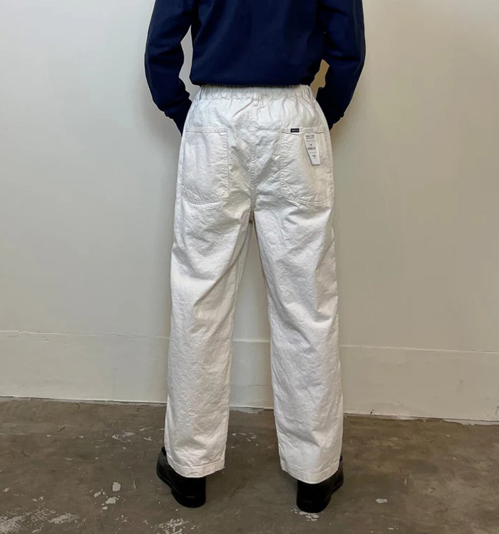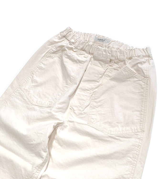 ウエストはゴムとドローコード(紐)仕様で、リラックスした穿き心地。30’sアメリカ軍ワークパンツをデザインソースに、フロントの長方形ポケットが程よいミリタリーニュアンスを添えます。股上を深く、ヒップとワタリにゆとりを持たせ、裾に向かってストンと落ちるワイドシルエット。ほどよい厚みのあるデニム生地がシルエットを美しく保ち、カジュアルになりすぎない印象に仕上がっています。