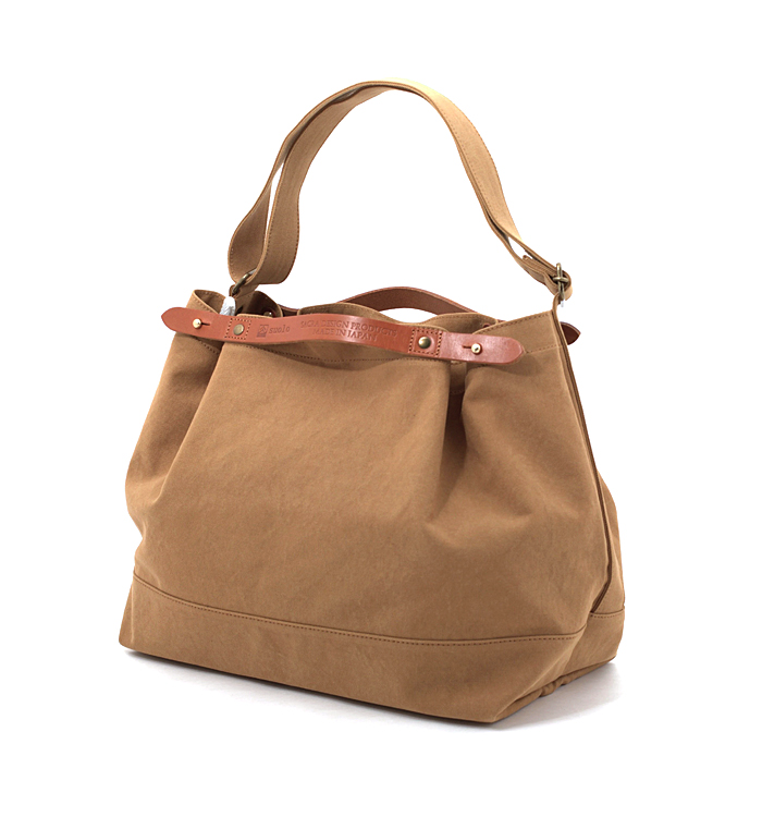 インビスタ社のコーデュラ糸と、再生PETのリサイクル糸で織ったキャンバス地を使用。堅牢度にすぐれた高機能素材で、引き裂きや擦り切れ、摩耗に対する強さを備えており、テフロン加工を施しているため、撥水や防汚機能にも優れています。ショルダーバッグとしてもトートバッグとしても使える2WAY仕様。底のマチを広く取っているので、たくさんの荷物を入れることができ、幅広めのストラップ紐を付けているので背負い続けても疲れにくいです。また、バッグの入れ口にジップを取り付けているので、雨でも濡れにくくなっています。