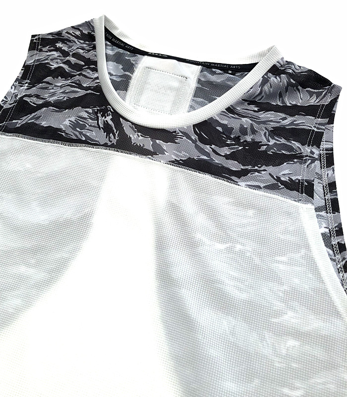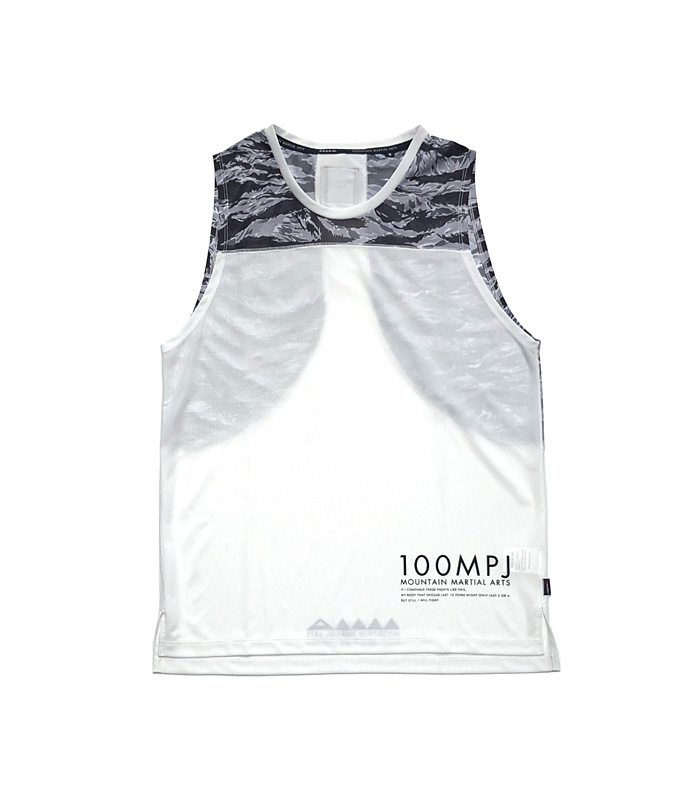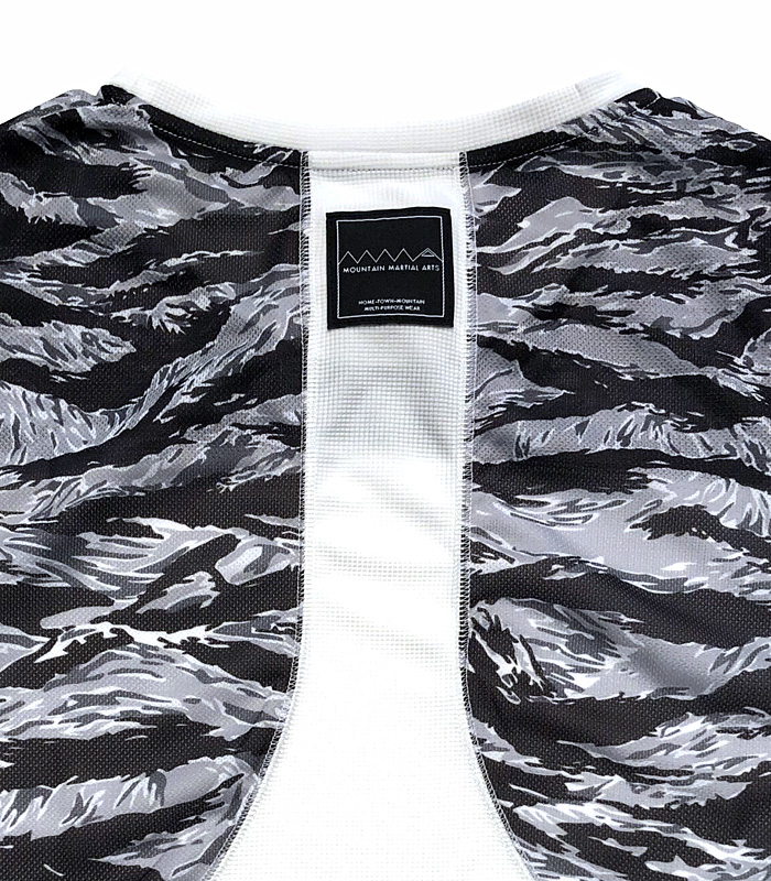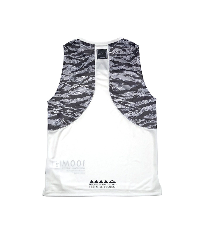 ベースはハイパフォーマンスランナー向けに開発されたスリーブレス。長時間の着用でもストレスを感じにくいよう肩幅と身幅を調整し、締め付け感のないバランスに仕上げています。日本製のオリジナルボディは、胸部と背面肩甲骨部をCOOLMAX®の速乾メッシュで切り替え、通気性を向上。肩甲骨に沿った立体的なパターンが腕振りをスムースにサポートします。メッシュ部分にはタイガーカモを昇華転写プリントし、機能性とデザイン性を両立しました。